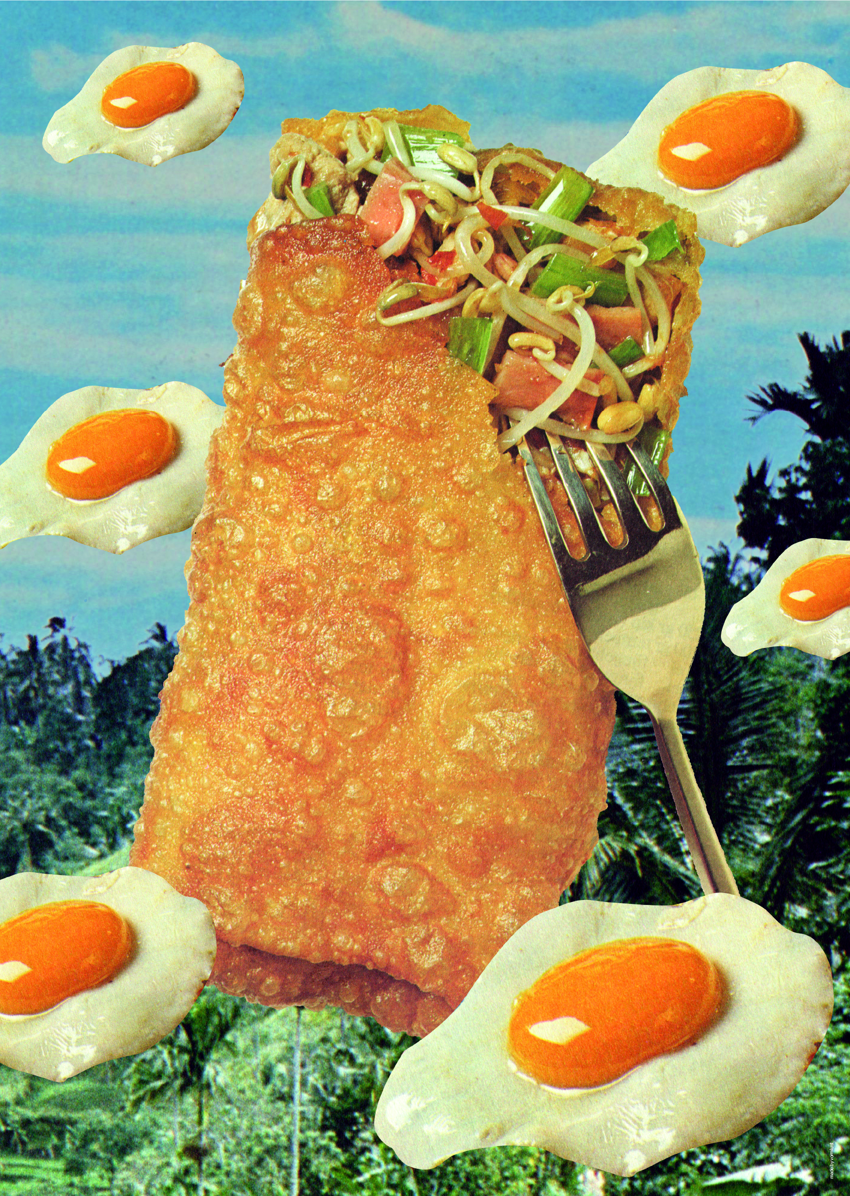 Een prachtige kroepia op een vork, met zwevende spiegel-eitjes rondom! Leuk voor in de keuken, woonkamer, badkamer, toilet en ga zo maar door!